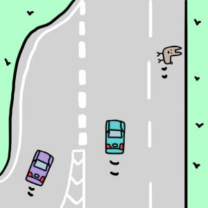 速度が速ければ速いほど、ハンドルを少し切っただけで、車の向きは大きく変わります。合流の際、あわててハンドルを切り過ぎて、隣の隣の車線まで行ってしまいそうになる方もいます。できるだけハンドルを切らずに滑らかに合流しましょう。